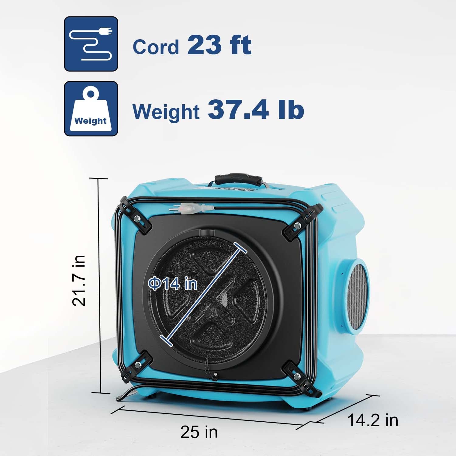 The AlorAir Zeus Extreme axial air mover delivers a powerful airflow of 3,000 CFM with a current draw of only 2.5 amps. Featuring two speed settings, it offers versatile performance across various environments. With daisy-chain capability for up to six units on a single 15-amp circuit and five adjustable drying positions, it provides maximum operational flexibility. This durable fan is built with a rugged, epoxy-coated steel housing and chemically resistant LLDPE housing units. It also includes a maintenance-free bearing motor, GFCI protection, a 20-foot power cord, and a user-friendly control panel, making it ideal for workshops, factories, garages, gyms, and home use.