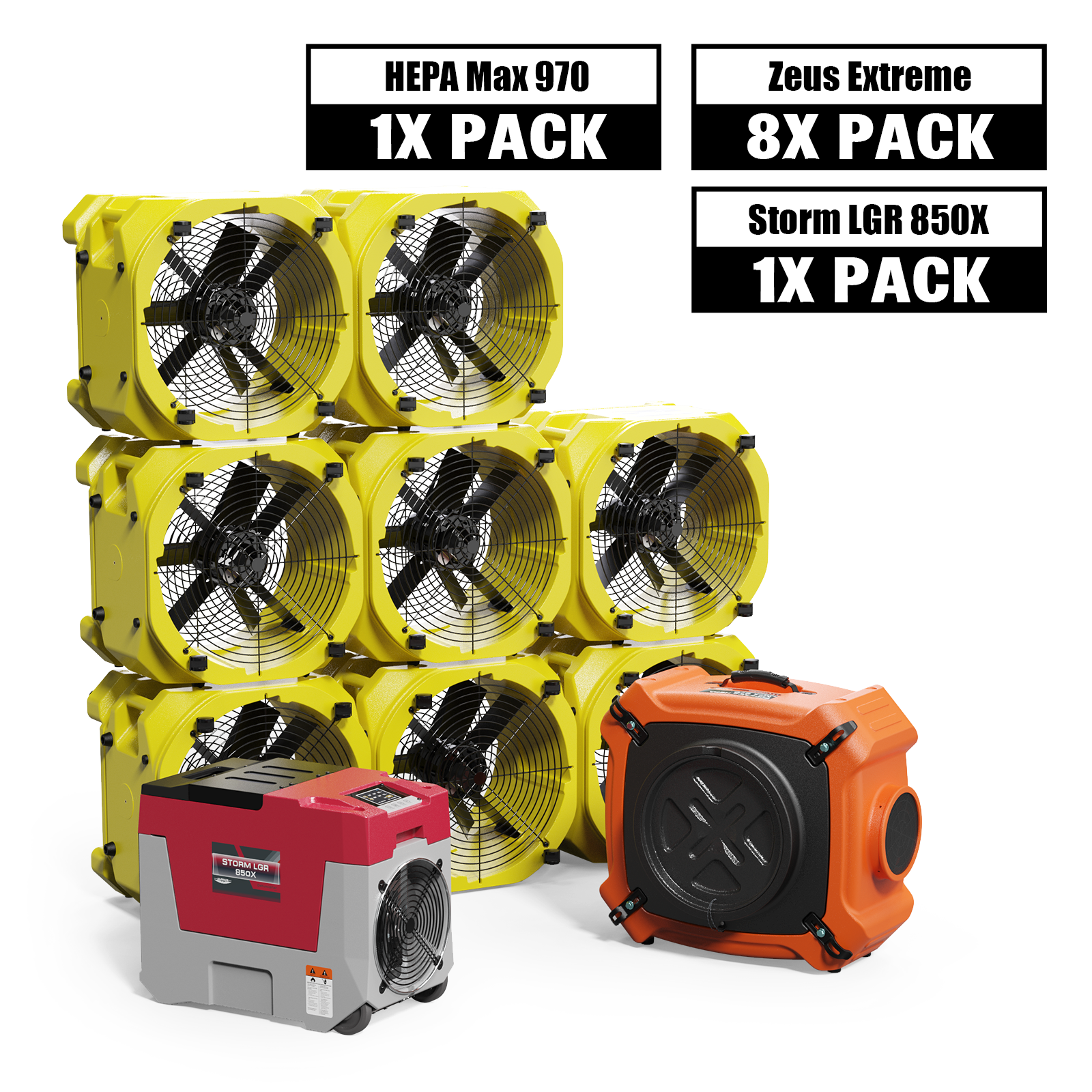 Includes: 1 × Storm LGR 850X WIFI Dehumidifier & 8 × Zeus Extreme Air Movers & 1 × PureAiro HEPA Maz 970 Air Scrubber