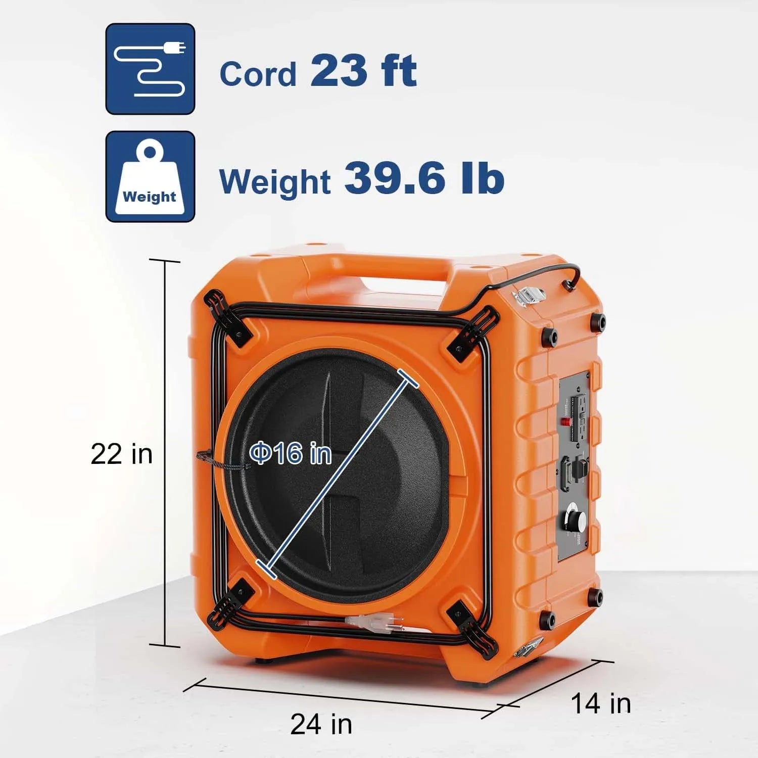 This air scrubber features an advanced 750 CFM airflow system with superior air intake capacity. It includes speed control, filter change indicator, and stackable roto-molded polyethylene housing. With 23-foot power cord, GFCI protection, and ETL/CETL safety certification, this unit provides professional-grade air purification for construction sites, restoration projects, and commercial applications requiring optimal air quality management.