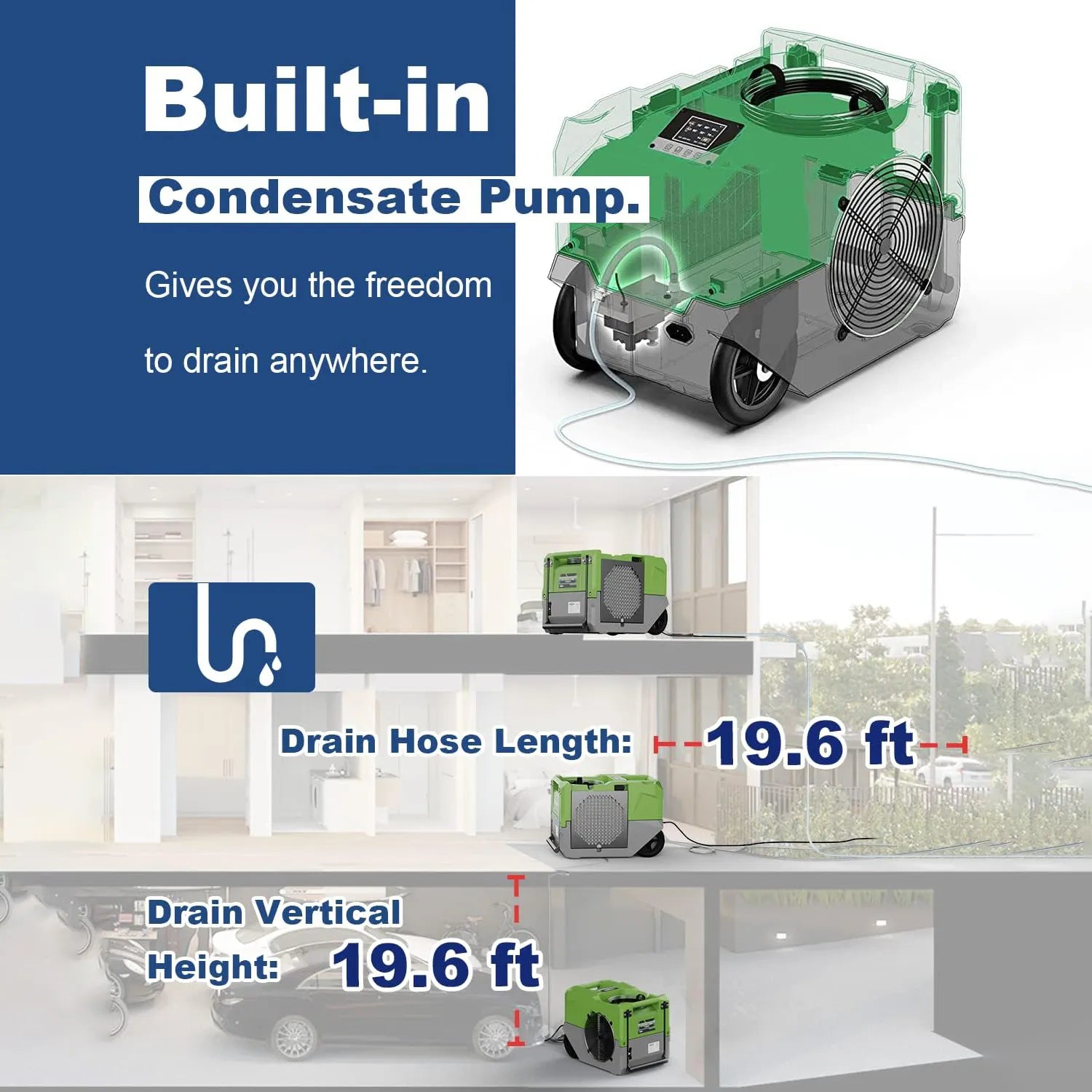 This dehumidifier removes 125 PPD of moisture at AHAM conditions with high energy efficiency (COP 2.66 L/kWh) and 8.1 amp current draw. Featuring a built-in condensate pump, MERV-8 filtration, and automatic humidistat control, it covers areas up to 3,000 sq. ft. The rotational molded body with easy-access components and stacking capability makes it ideal for flood restoration, basements, laundries, and continuous commercial applications.