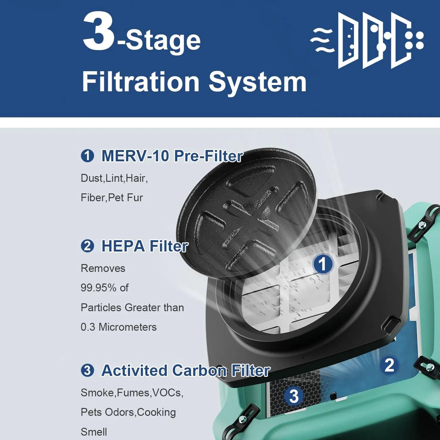 This compact air scrubber offers 3-stage filtration with MERV 10 pre-filter, activated carbon, and HEPA filtration. Featuring stackable design, GFCI protection, and 23-foot power cord, this ETL-certified unit is ideal for home repairs, construction sites, and environments requiring portable, efficient air purification.