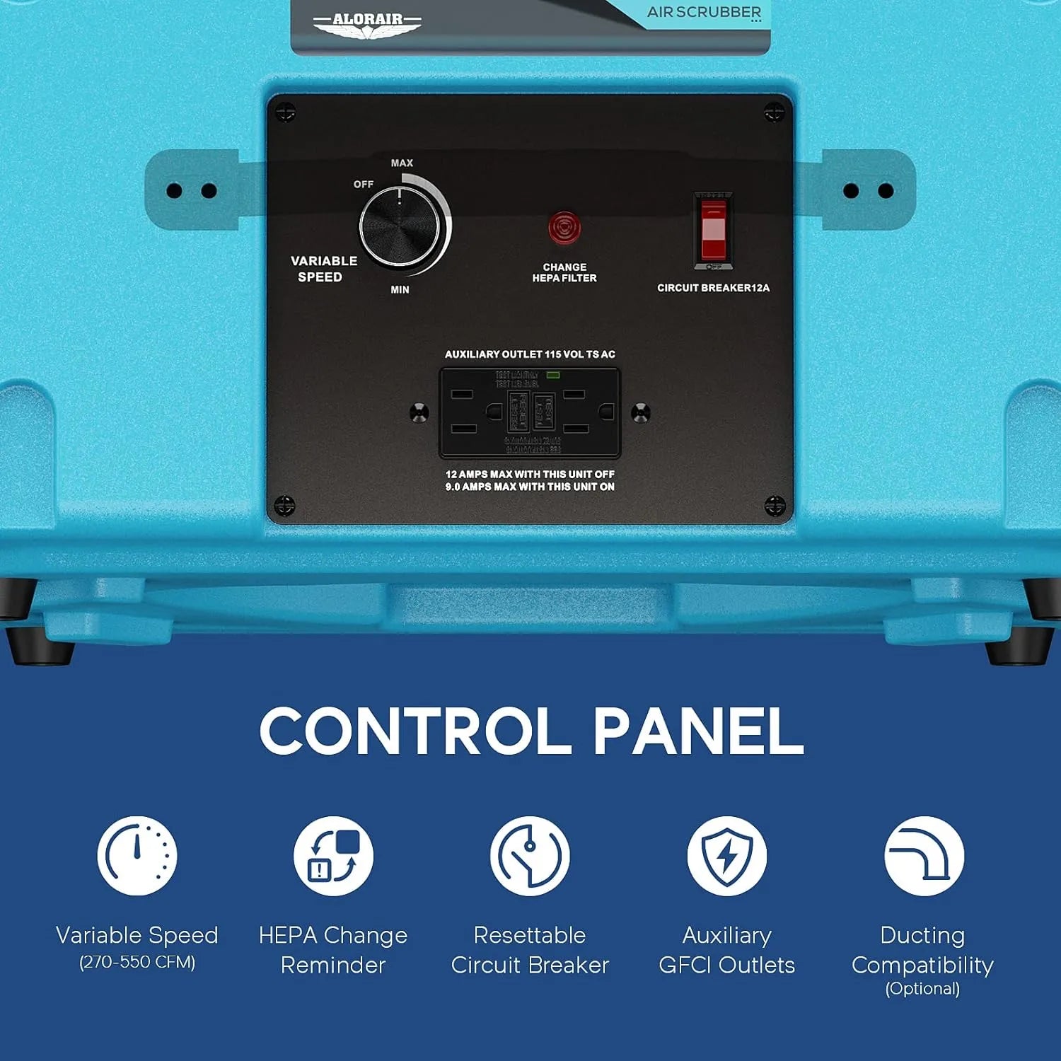 This air scrubber features a 3-stage filtration system with MERV-10 pre-filter, activated carbon filter, and HEPA filter. It delivers 550 CFM on high setting, with GFCI protection, filter change indicator, and stackable roto-molded housing. The compact, lightweight design is ideal for restoration sites, construction areas, and spaces requiring removal of airborne particles and odors.