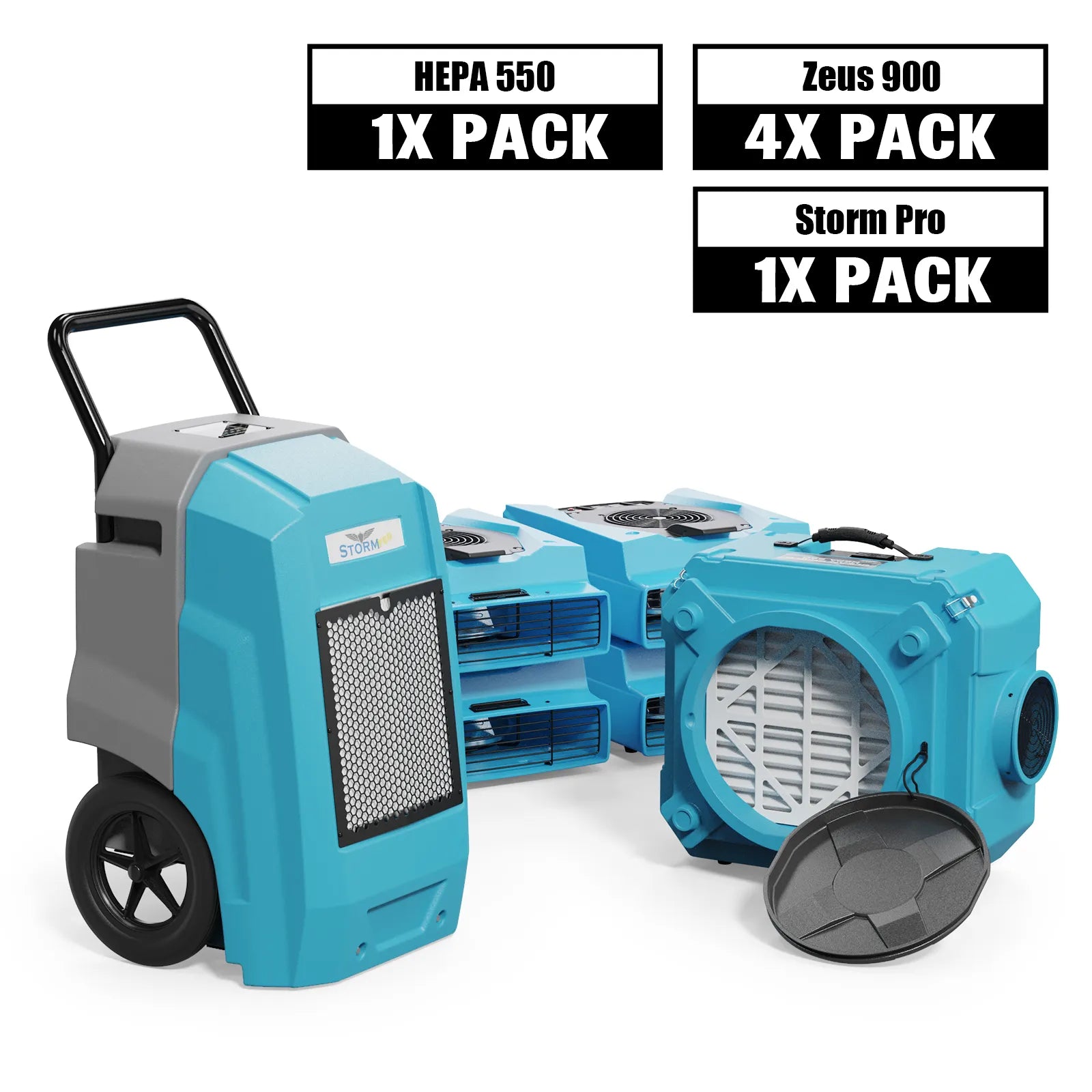 This package includes one Storm Pro Commercial Dehumidifier, four Zeus 900 Axial Air Movers, and one CleanShield HEPA 550 Air Scrubber. All units feature professional-grade construction and are designed to work together for comprehensive moisture control and air purification in demanding environments.