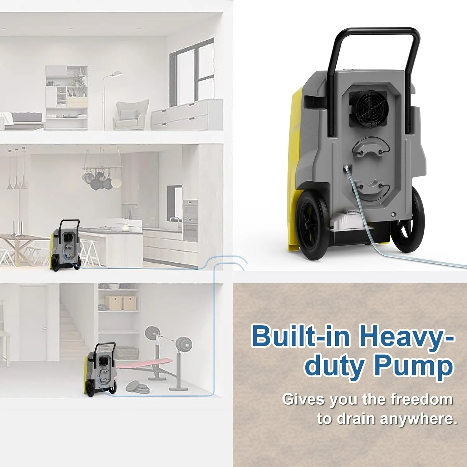 This dehumidifier removes up to 180 pints of moisture per day under saturation conditions, making it suitable for areas up to 2,300 square feet. It features a hot gas valve defrosting system, rare earth alloy tube evaporator, and heavy-duty condensate pump. With quick-connect hose/pump fittings and easy-transport handles, this unit is ideal for water damage restoration, research facilities, storage areas, and underground construction sites.