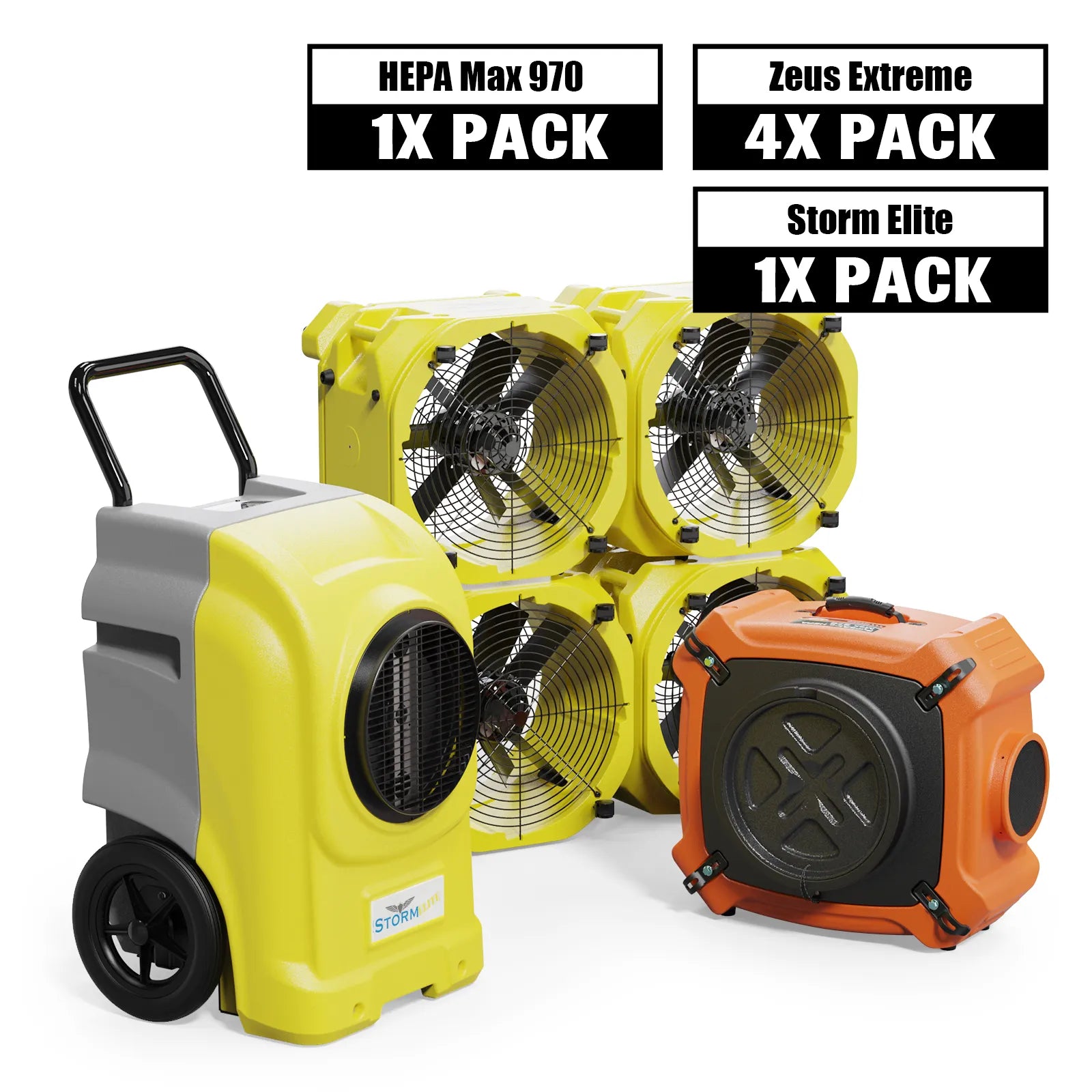 This package includes one Storm Ultra Wi-Fi Commercial Dehumidifier, four Zeus Extreme Axial Air Movers, and one PureAiro HEPA Max 970 Air Scrubber. All units feature professional-grade construction and are designed to work together for comprehensive moisture control and air purification in commercial environments.