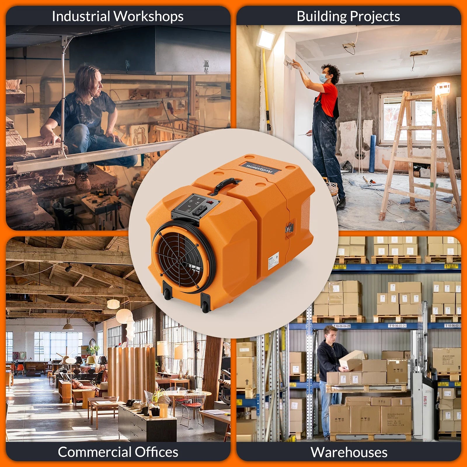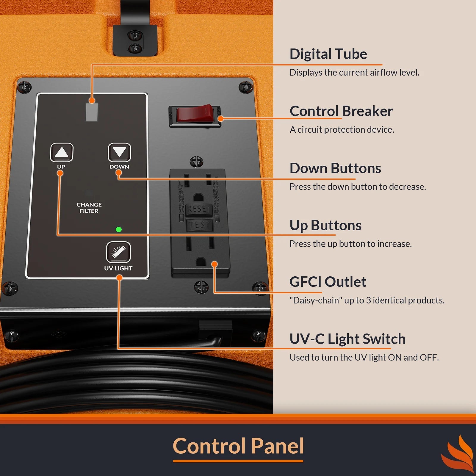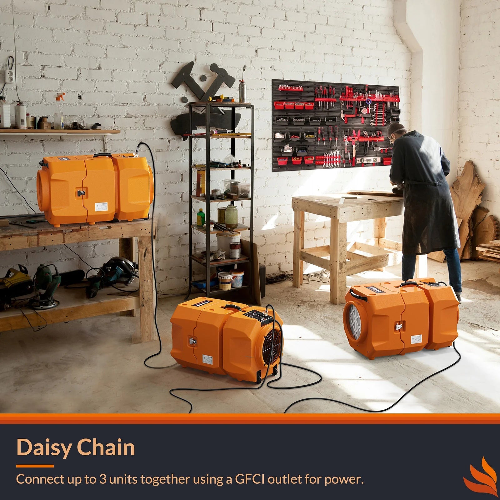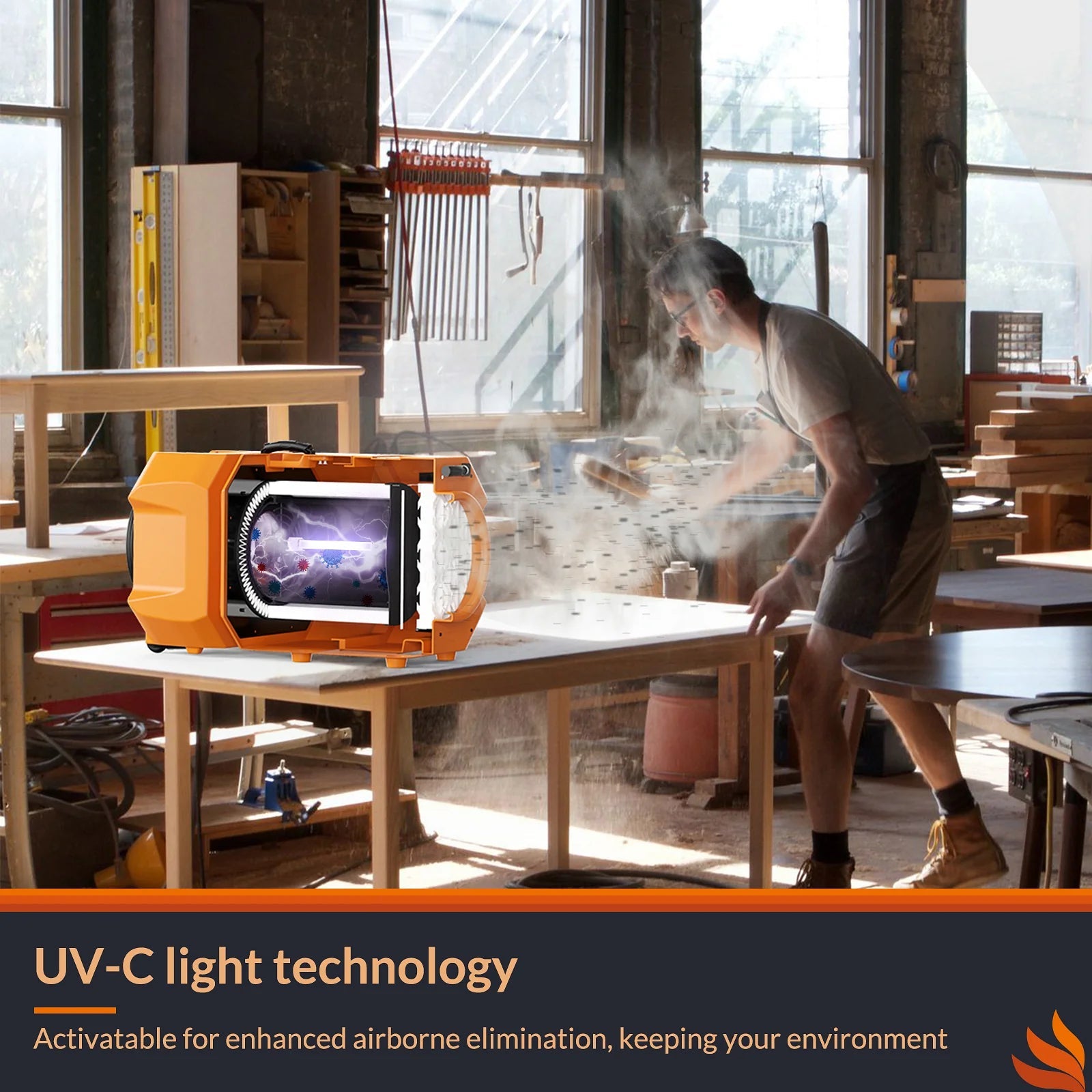 Equipped with a powerful 900 CFM fan and a 2-in-1 HEPA/activated carbon filter, this air scrubber efficiently captures microscopic particles and neutralizes odors. Enhanced with UV-C light technology, it provides an additional layer of air sanitization, making it well-suited for large-scale renovation, restoration, and commercial projects covering areas up to 1,100 square feet. The unit supports daisy-chaining of up to three devices and features a stackable design for secure transport and storage. With its straightforward control panel and robust performance, it is an effective solution for maintaining air quality in demanding environments.