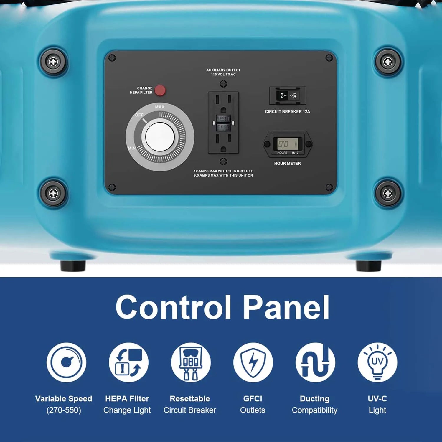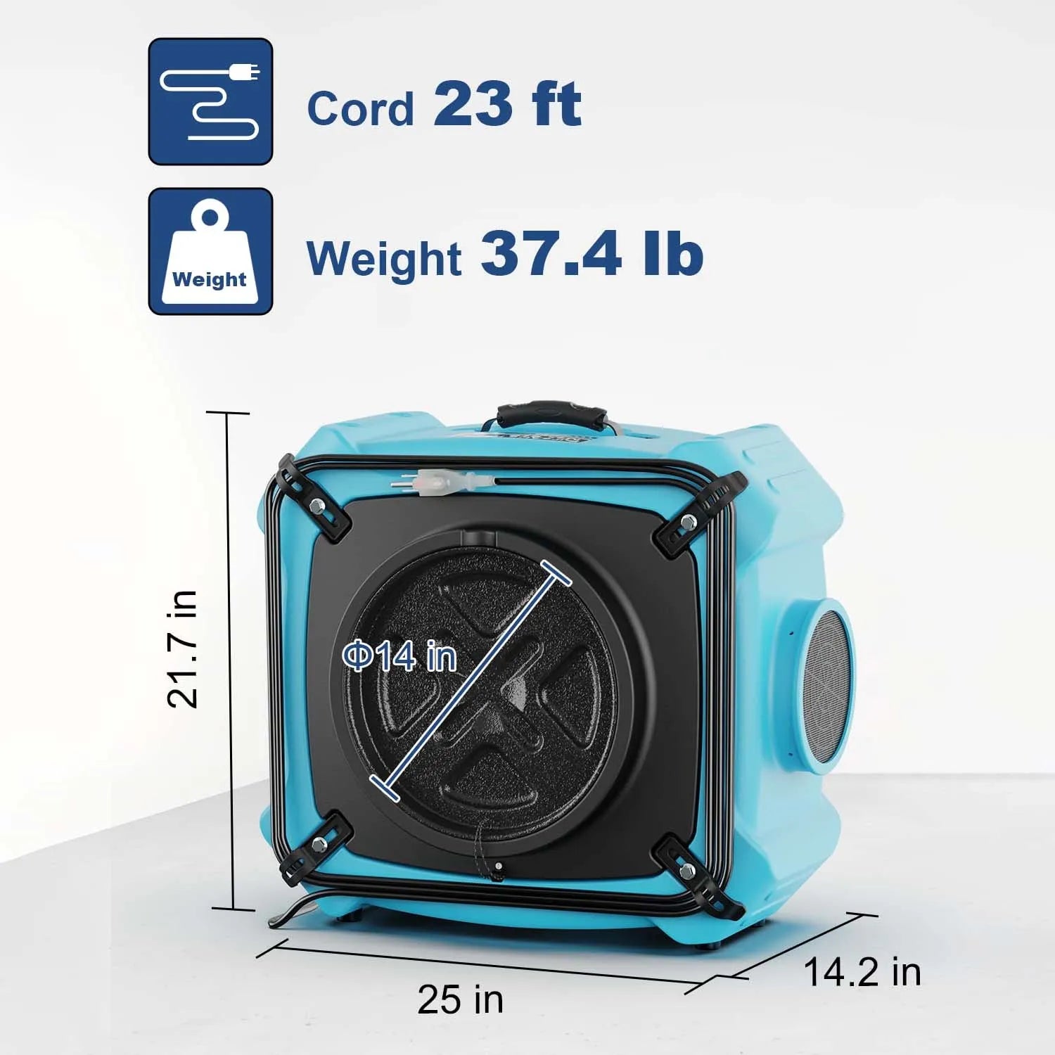 This air scrubber features advanced filtration technology with 550 CFM maximum airflow capacity. It boasts a durable roto-molded polyethylene housing, filter change indicator, and stackable design. With 23-foot power cord, GFCI protection, and ETL/CETL safety certification, this unit provides professional-grade air purification for construction sites, restoration projects, and commercial applications requiring superior air quality management.