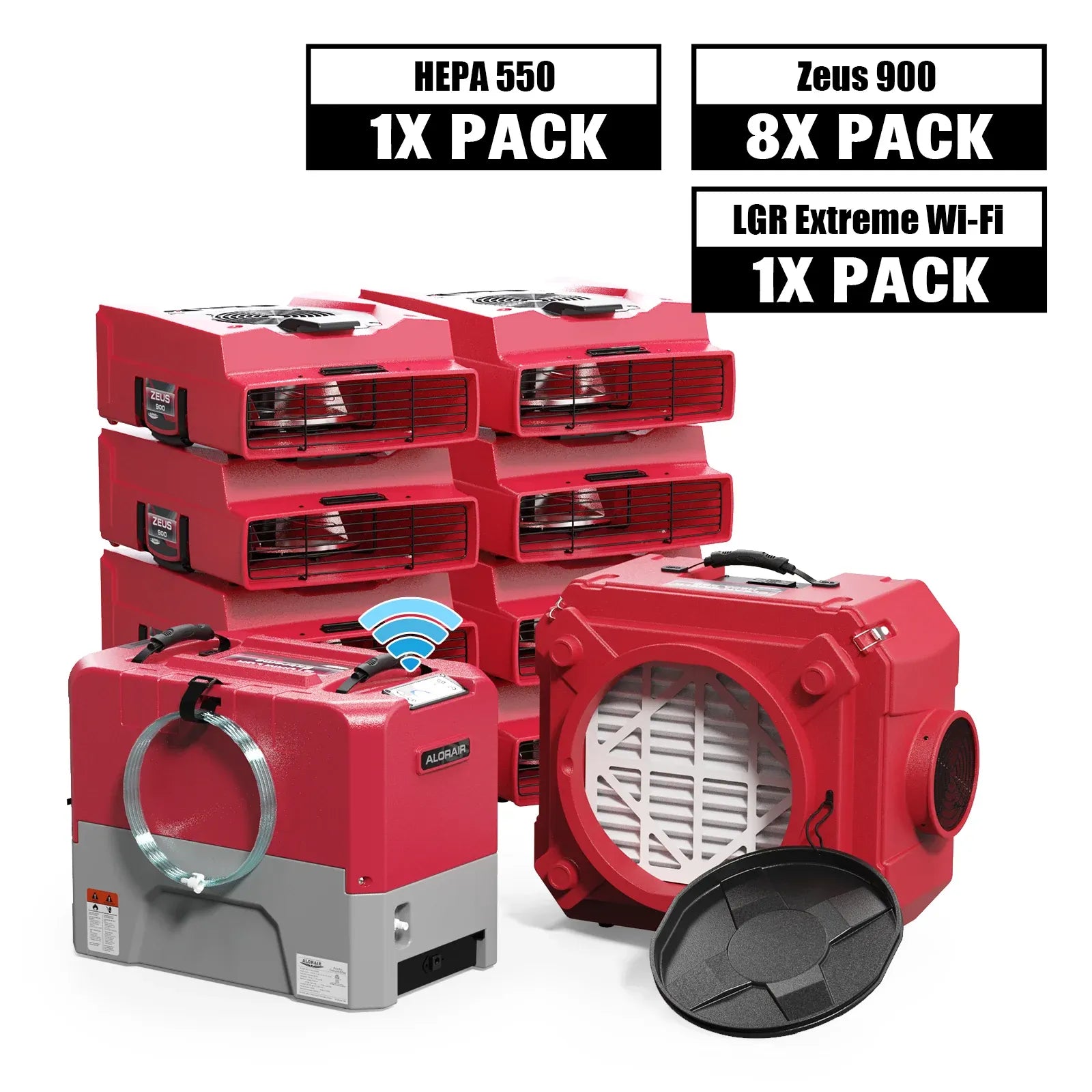 Alorair Water Damage Restoration Combo Pack, 1 X Storm LGR Extreme WI-FI Commercial Dehumidifier, 8 X Zeus 900 Air Mover, 1 X CleanShield HEPA 550 Scrubber