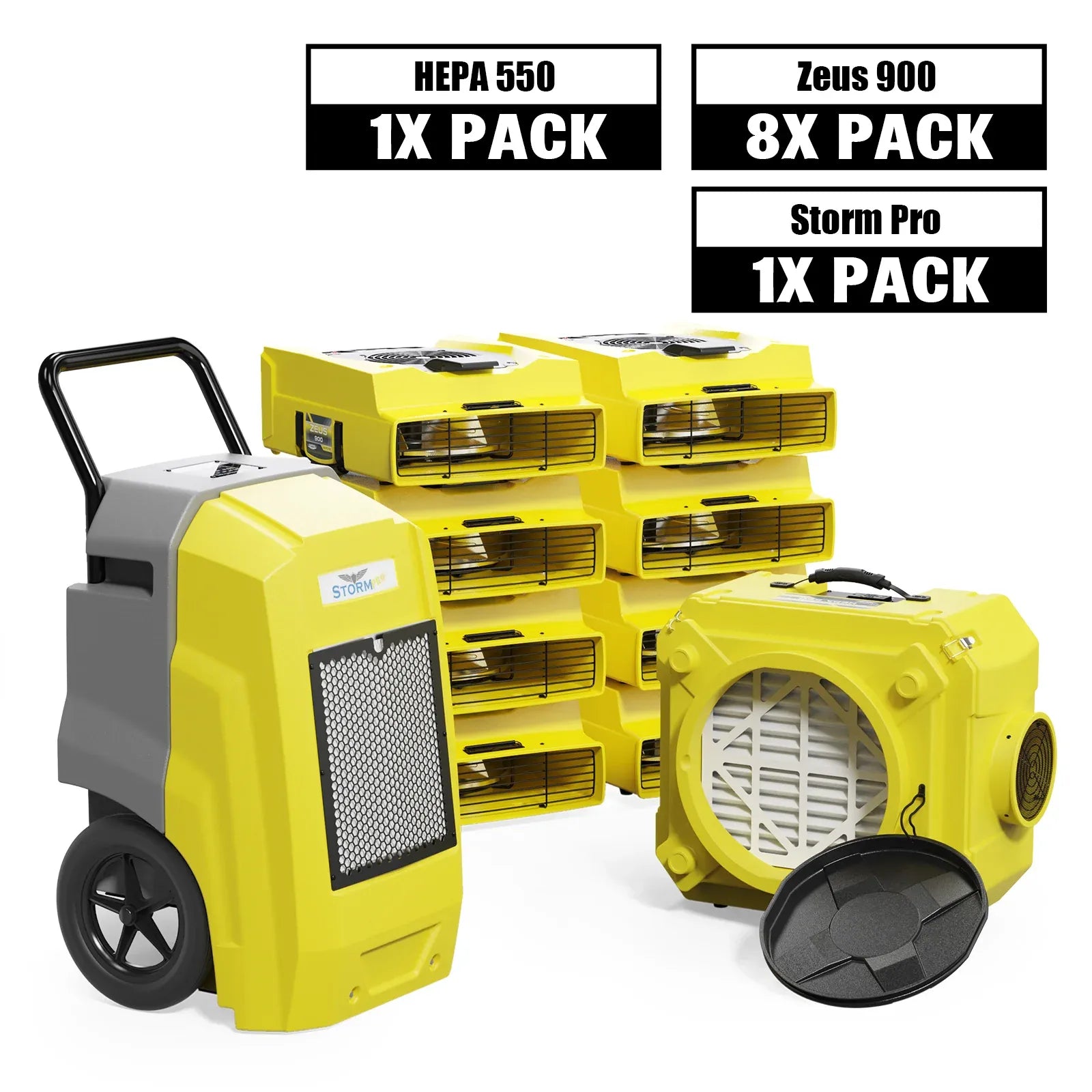 This package includes one Storm Pro 85 Dehumidifier, eight Zeus 900 Air Movers, and one CleanShield HEPA 550 Air Scrubber. All units feature stackable designs and durable construction for easy portability and storage in commercial restoration applications.