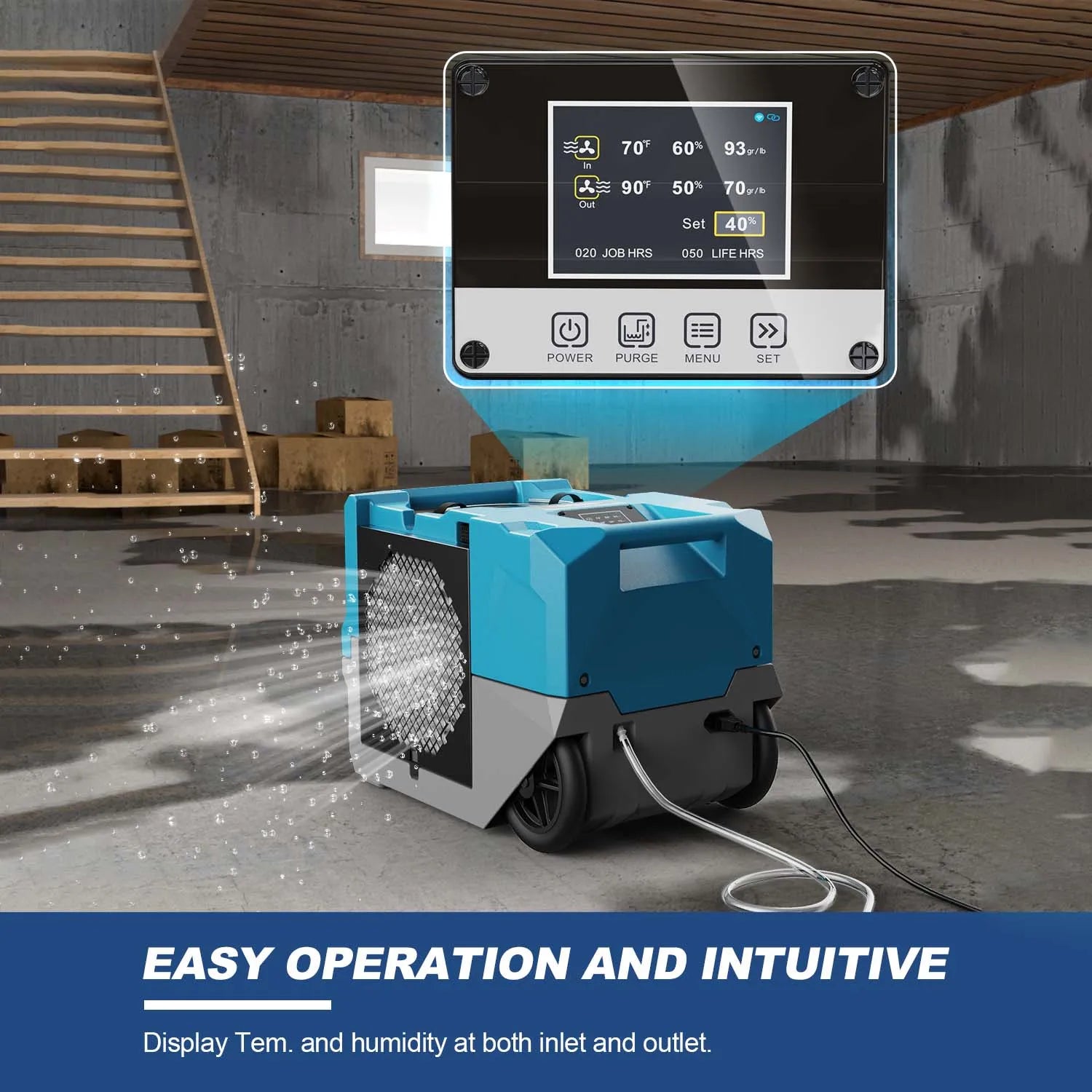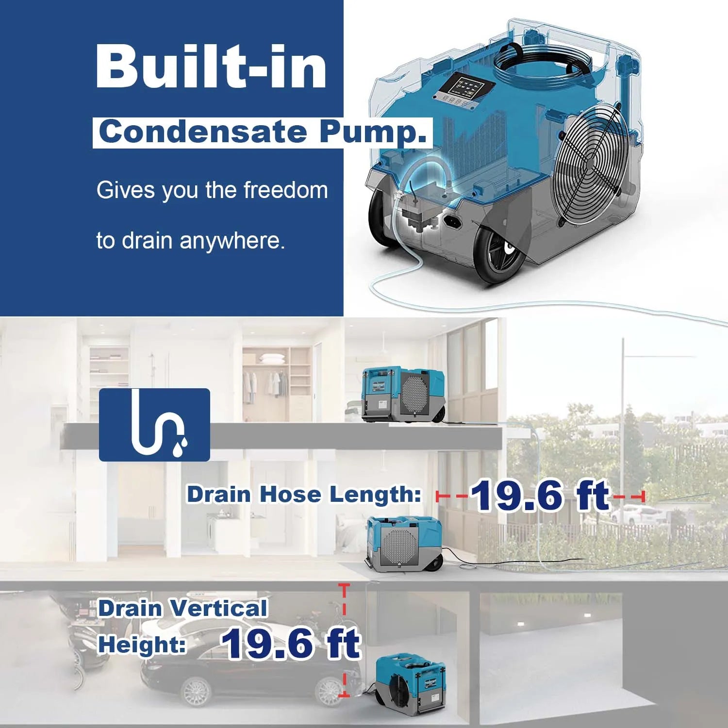 These dehumidifiers remove up to 270 PPD of moisture under saturation conditions (125 PPD at AHAM), with each unit suitable for areas up to 3,000 square feet. They feature automatic digital humidistat control, integrated condensate pumps, and efficient operation even in low humidity environments. With portable wheel design, auto defrosting, and quiet operation (<60 dB), these heavy-duty units are ideal for water damage restoration, flood recovery, basements, laboratories, and commercial applications requiring reliable moisture control.