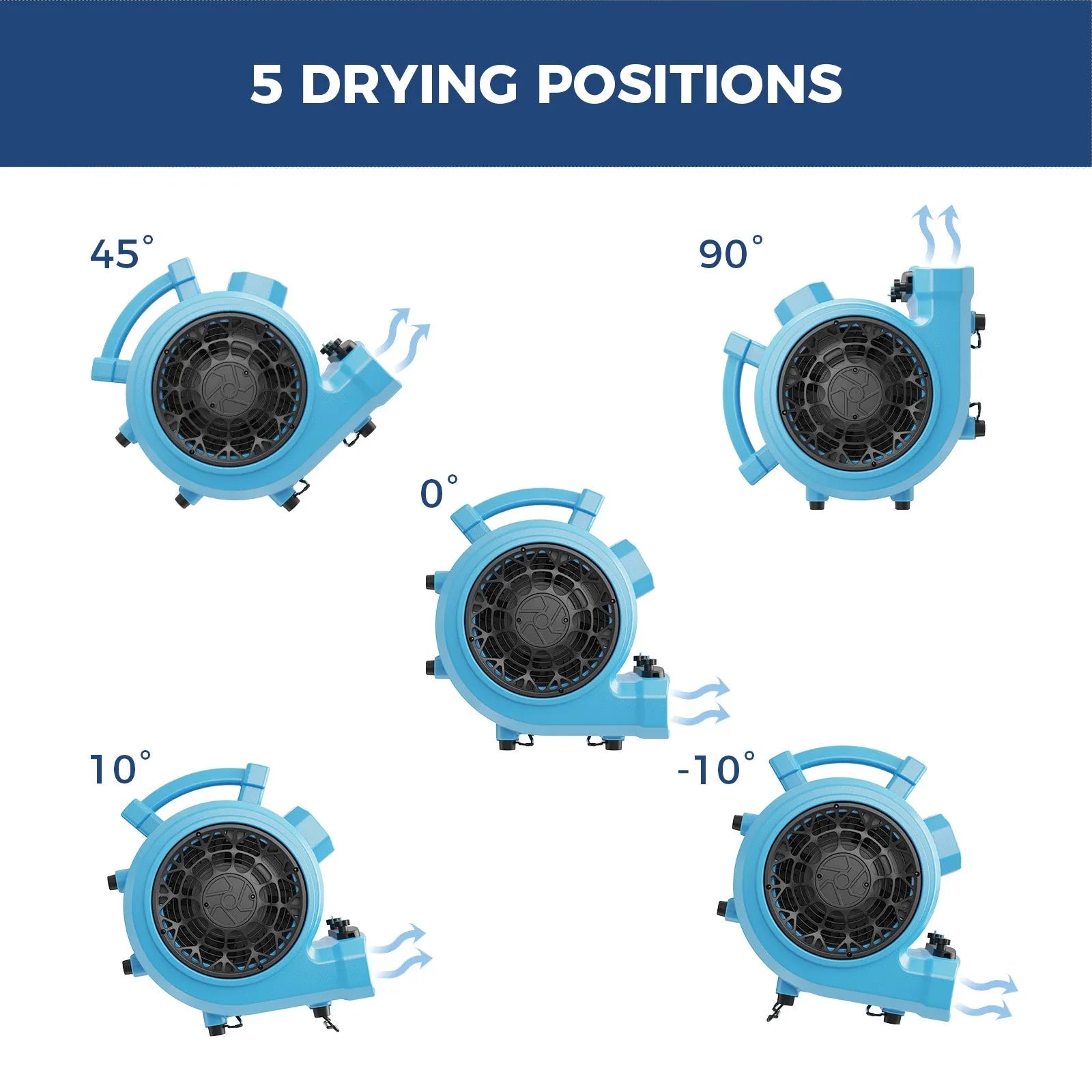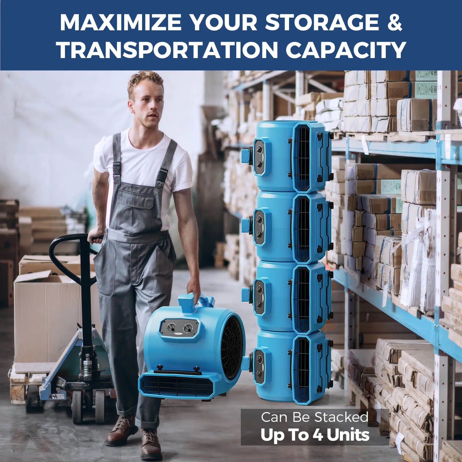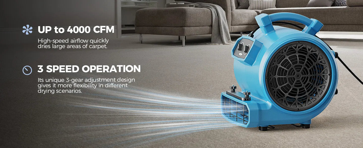 These air movers deliver powerful airflow up to 4000 CFM through three adjustable speeds, efficiently drying surfaces such as carpets, floors, furniture, and walls. The lightweight, stackable design features a durable PP housing, five adjustable operating positions (0°, 45°, 90°, +10°, -10°), a built-in 3-hour timer, and a 20 ft. power cord. Equipped with a carpet clasp for secure drying and easy portability, they are essential for enhancing ventilation and accelerating evaporation in water damage restoration, working seamlessly with dehumidifiers and air scrubbers.