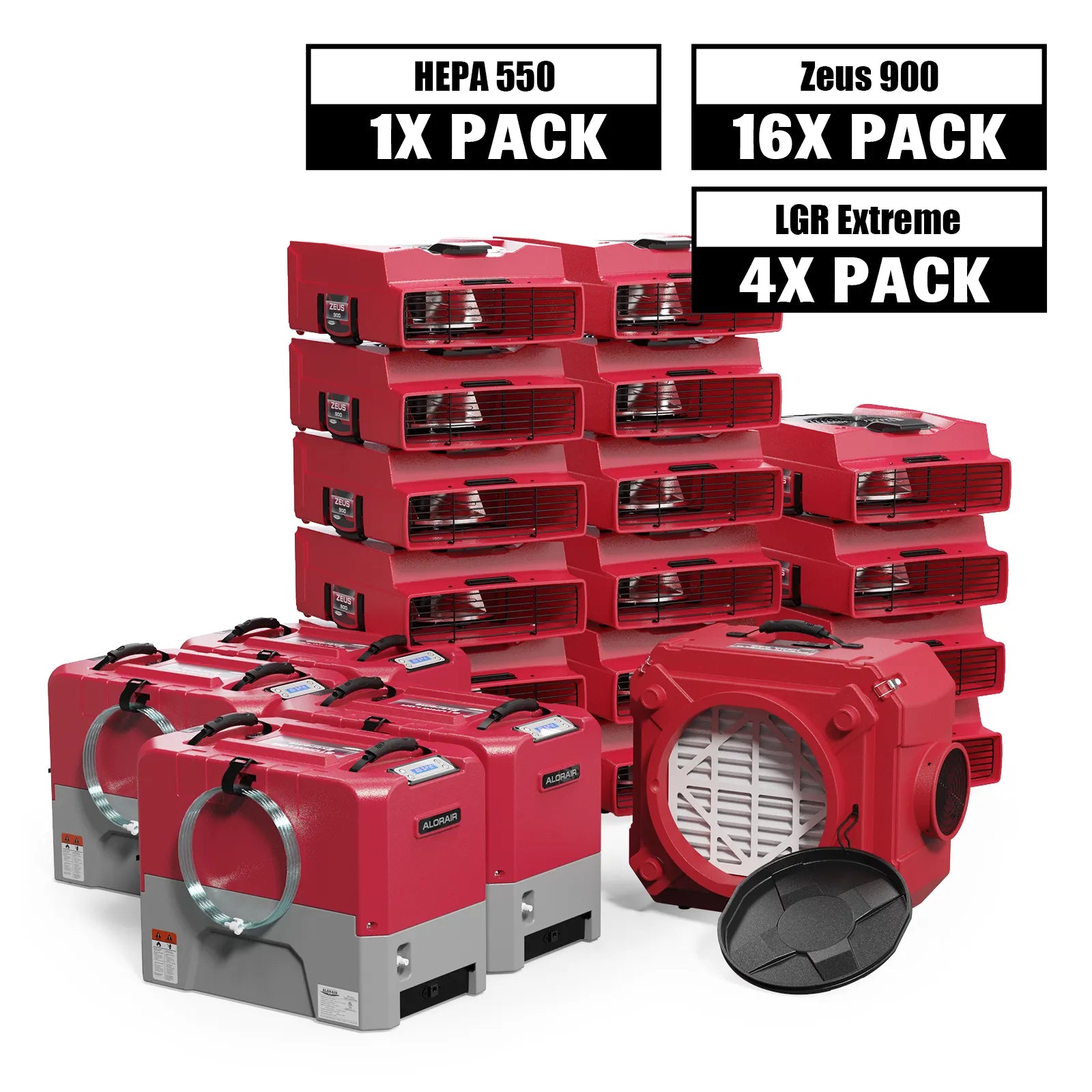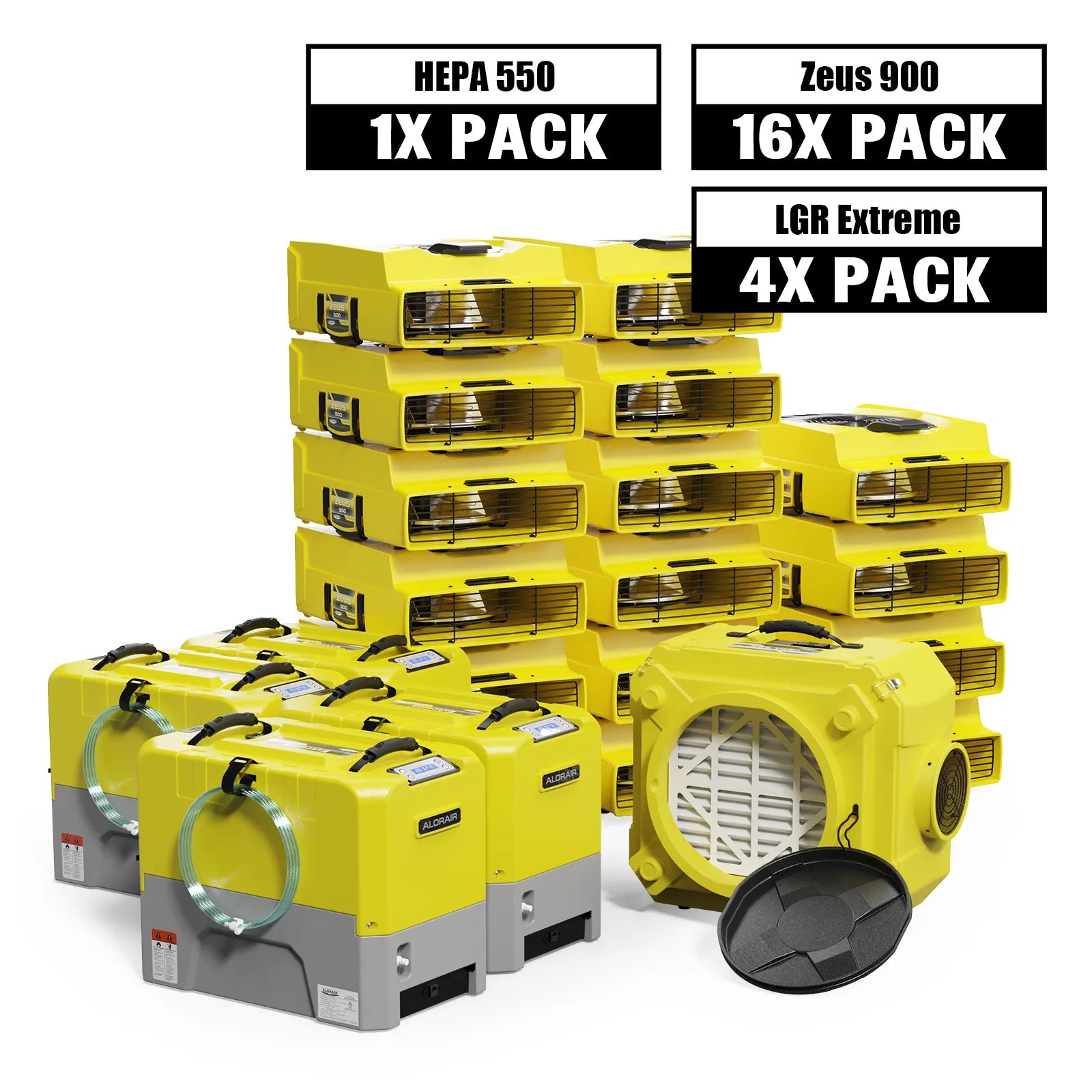 Alorair Water Damage Restoration Combo Pack, 4 X Storm LGR Extreme 85 Pint Commercial Dehumidifier, 16 X Zeus 900 Air Mover, 1 X CleanShield HEPA 550 Scrubber
