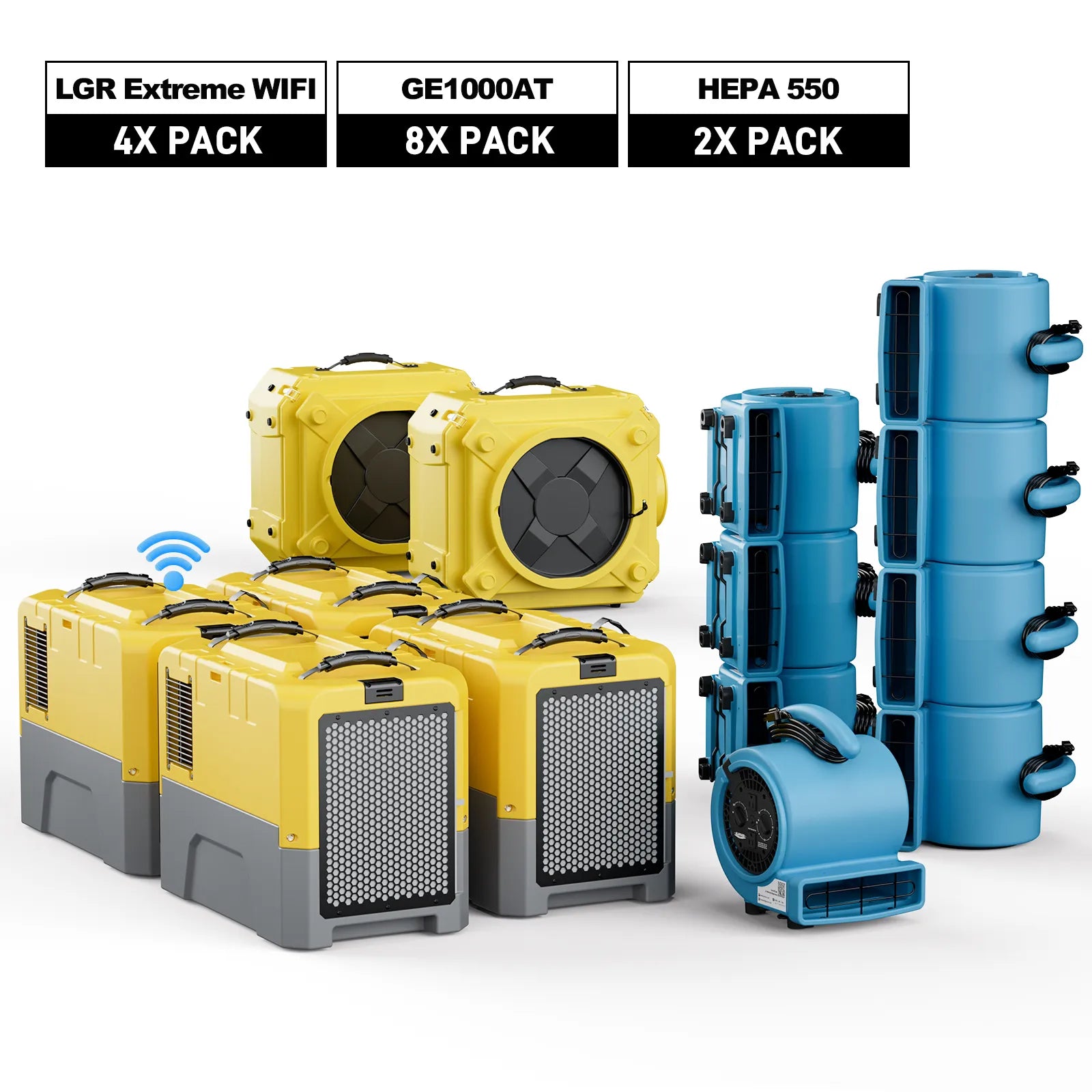 This package includes four Storm Extreme LGR WIFI Dehumidifiers, eight GE1000A Air Movers, and two CleanShield HEPA 550 Air Scrubbers. All units in this bundle are compact and stackable for easy portability and storage.