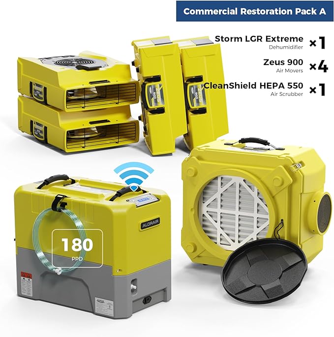 - ALL-IN-ONE Commercial Restoration combo package Deals of 1pc 180 pints Compact LGR Dehumidifier, 4 pcs 950 CFM Air Movers, and 1pc CleanShield HEPA 550 Air Scrubber, All the equipment in this bundle are compact and stackable for portability and storage.
